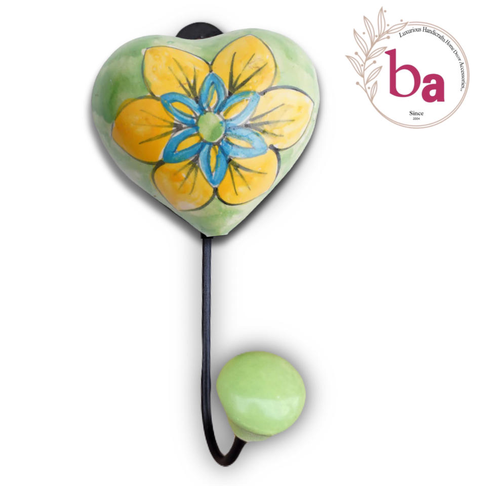 Hand-Crafted Green Yellow Ceramic Heart Tile Wall Coat Hook Keychain Hanger Elegant Floral Design Durable Stylish Hooks Rails