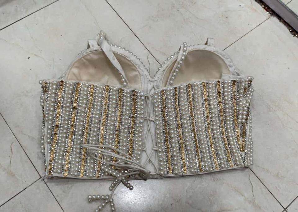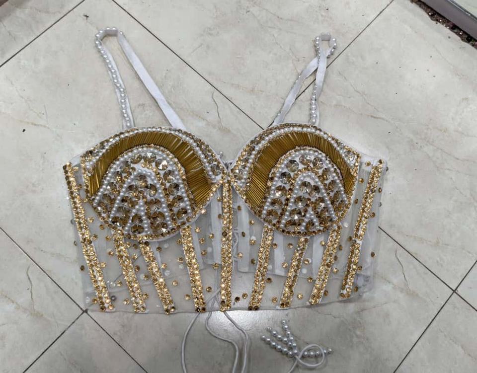 Hand-Embellished White Corset Bustier with Pearls, Rhinestones & Gold Beading