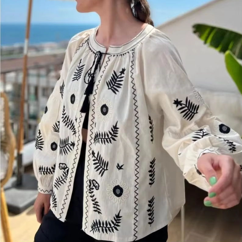 Women's Blouson Boho Suzani Embroidery Cotton Jacket Mandarin Collar Breathable Eco-Friendly Windproof Autumn Outerwear Winter