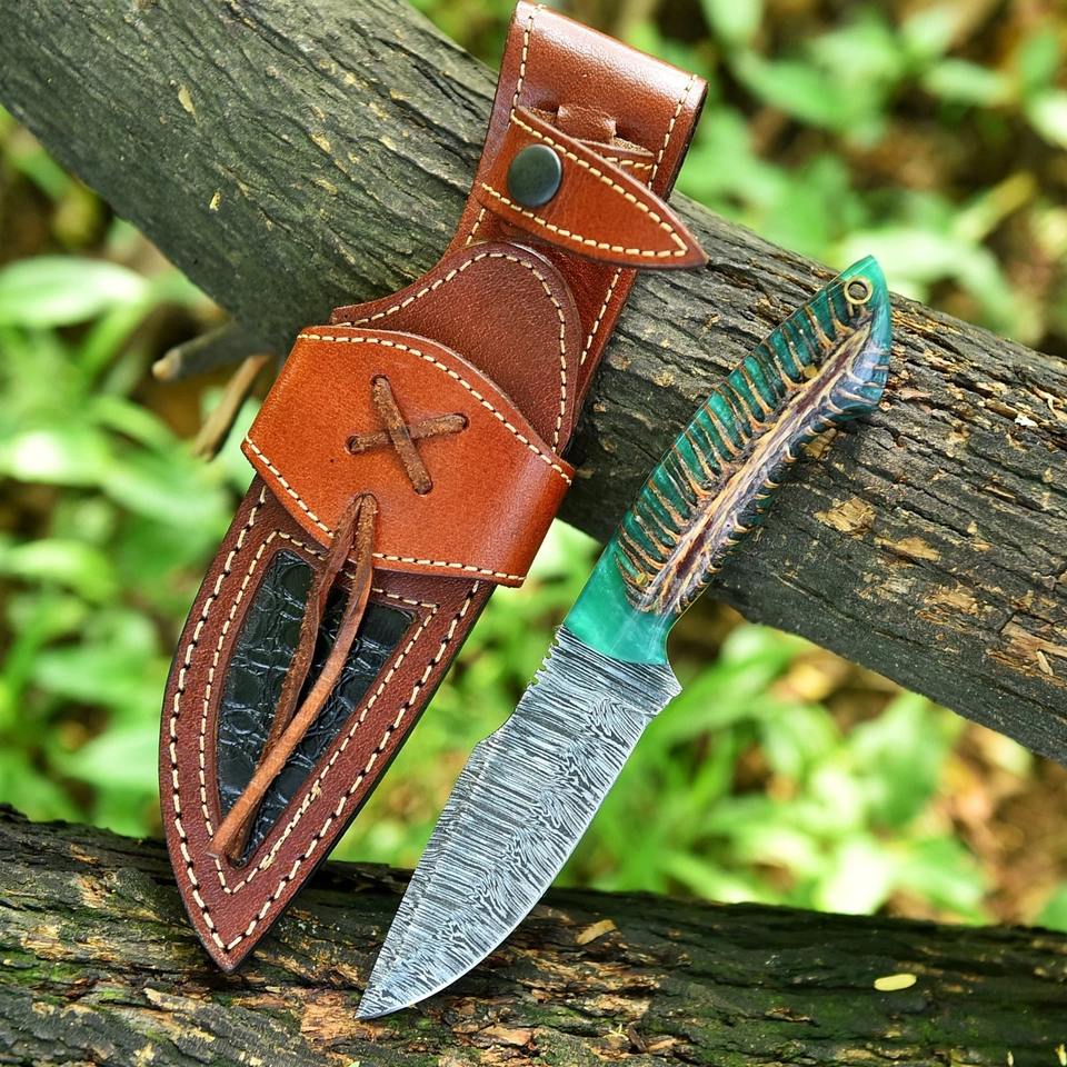 Hand Forged Damascus Custom Pine Cone Resin Handmade Skinner Hunting Knife Sheath OEM Supported Fixed Blade Camping Knife