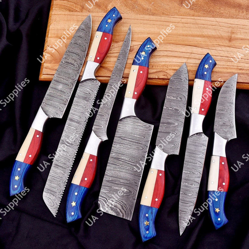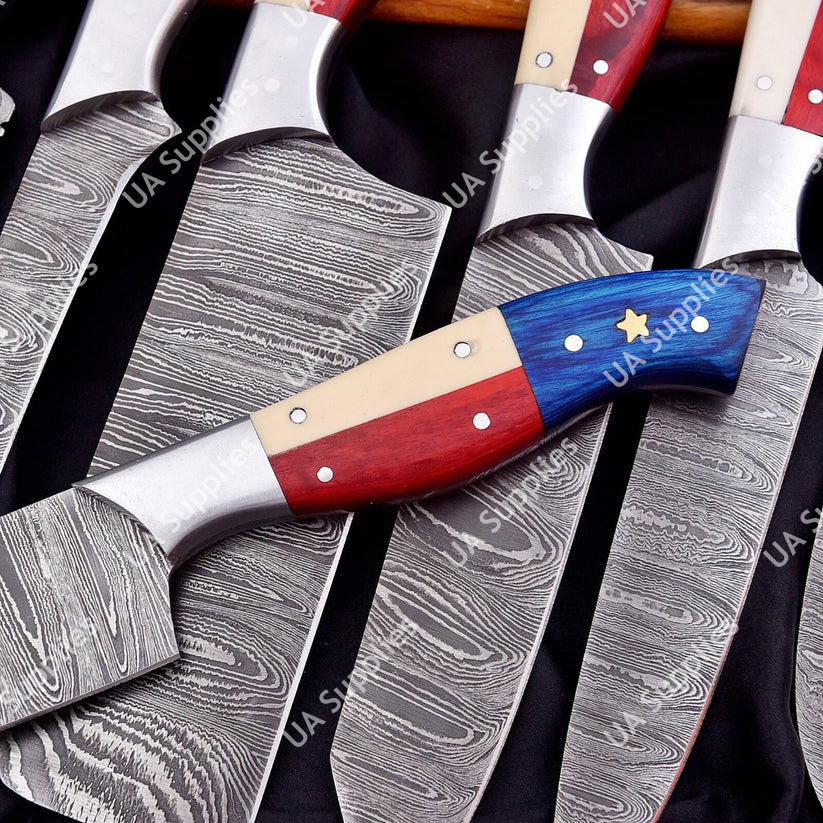 Hand Forged Damascus Steel 8 Pcs Chef Knives Razor Sharp Multi-Purpose Daily Tasks Kitchen Knife Color Wood Handle Leather