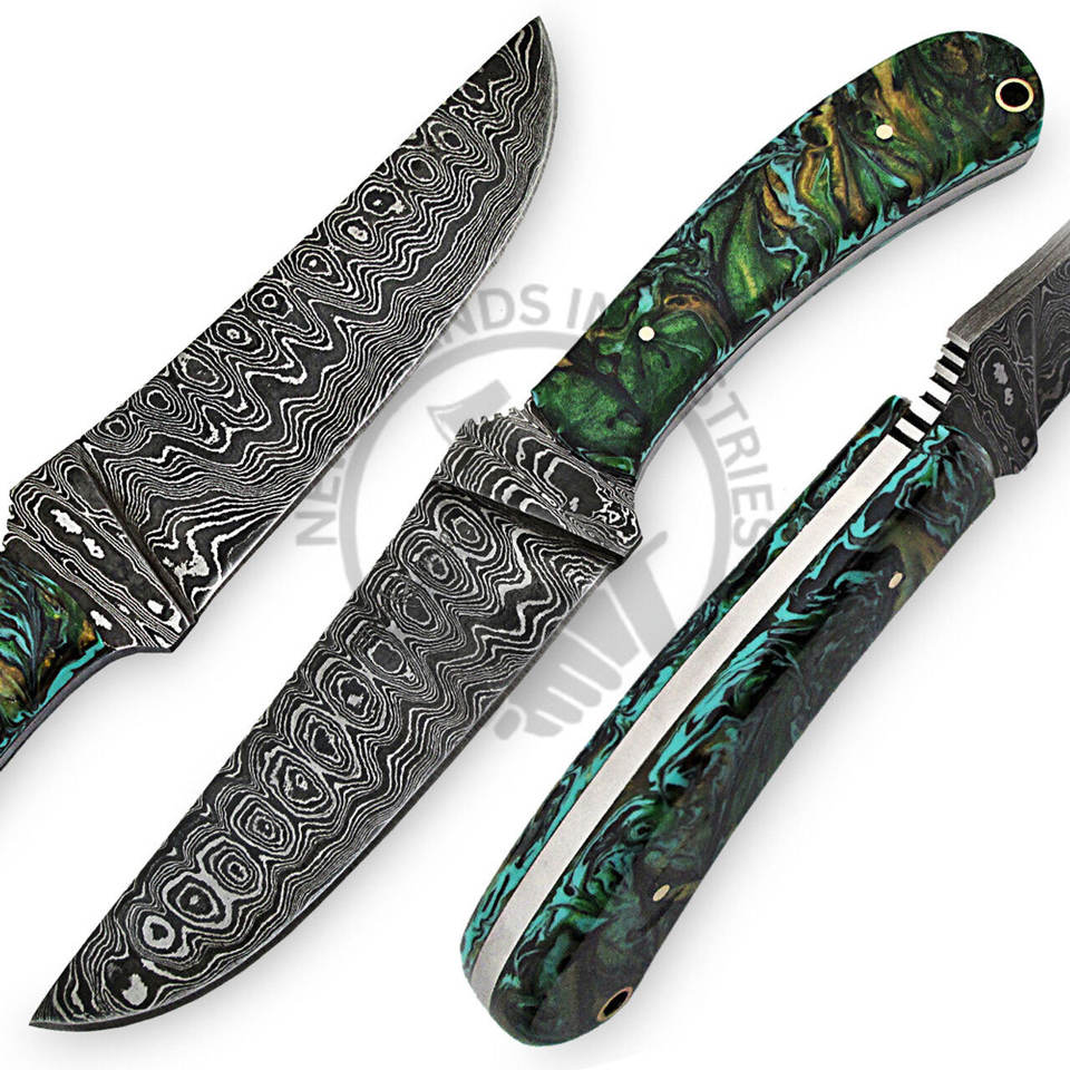 Hand Forged Damascus Steel Full Tang Drop Point Multifunction Outdoor Hunting Camping Knife DIY ODM/OEM Metallic Resin