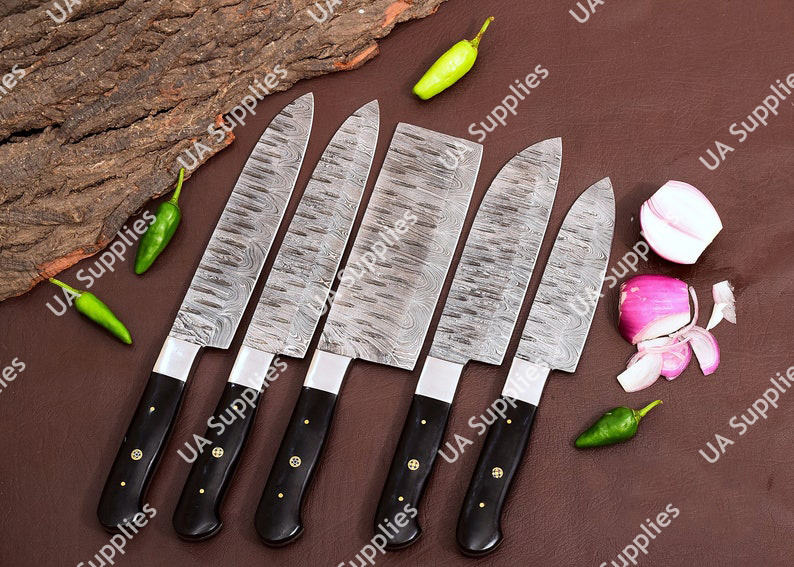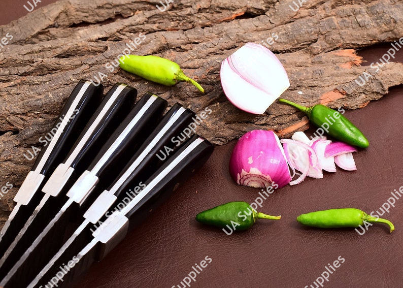 Hand Forged Damascus Steel Hammered Blade 58 HRC Razor Sharp Kitchen Chef Set Black Handle Outdoor Cooking Camping Kitchen Knife