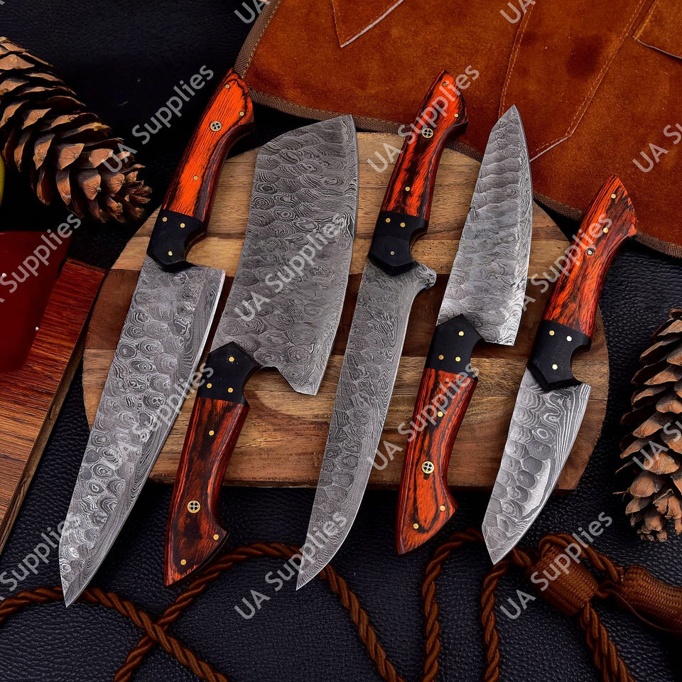Hand Forged Damascus Steel Unique Hammered Look Full Tang Lightweight Professional Chef Knife Set Red Wood Handles Knives