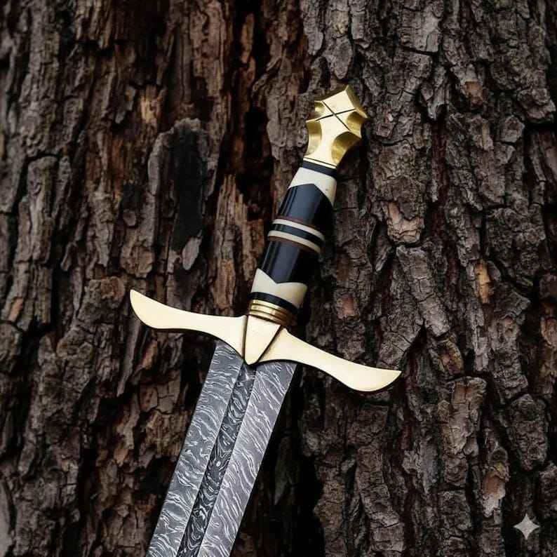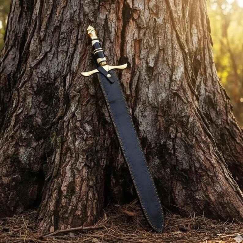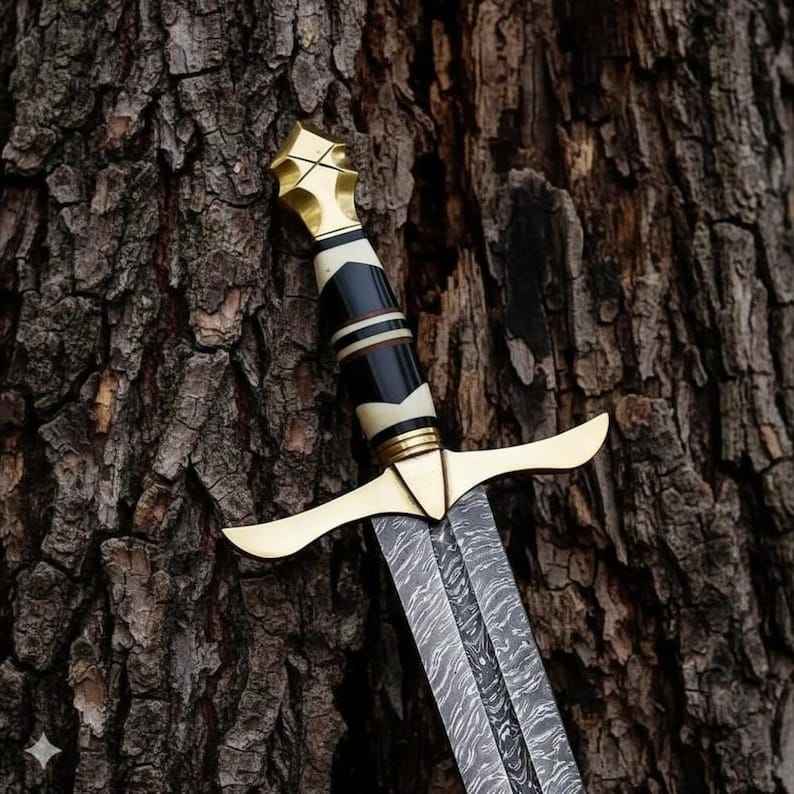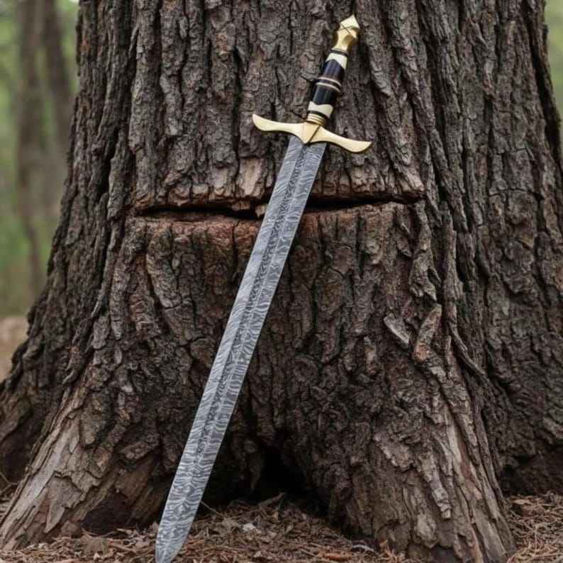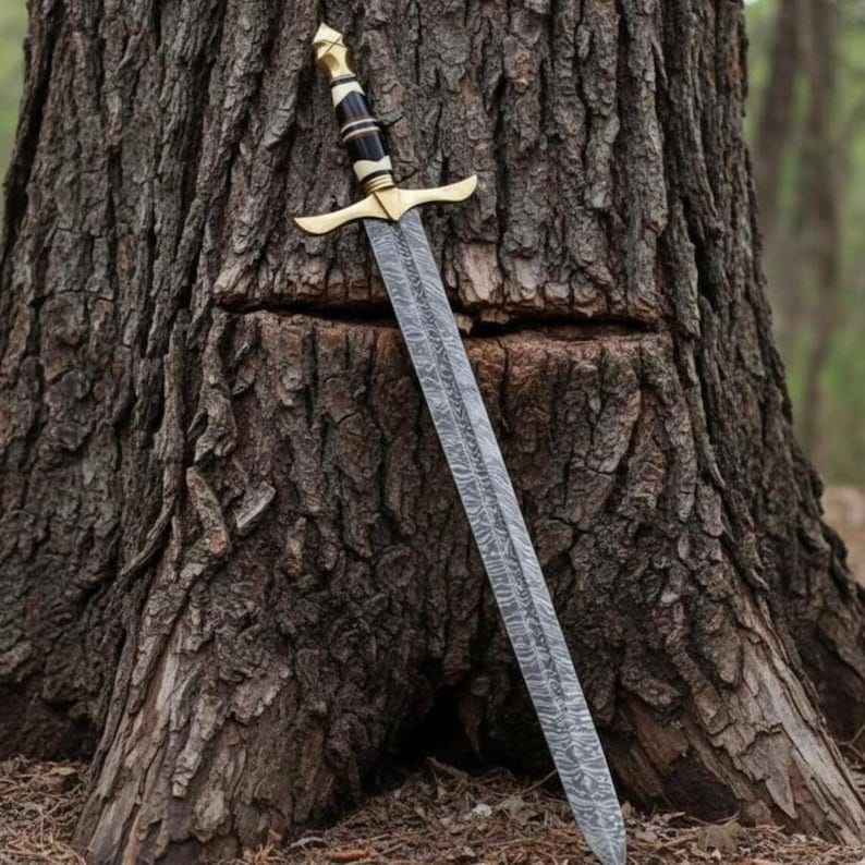 Hand Forged Damascus Steel Viking Sword with Carved Wooden Scabbard Medieval Norse Style Outdoor Camping Warrior With Sheath