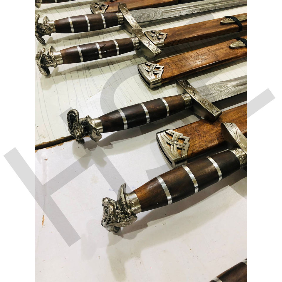 Hand Forged Damascus Steel Viking Sword with Carved Wooden Scabbard Medieval Norse Style Warrior Blade