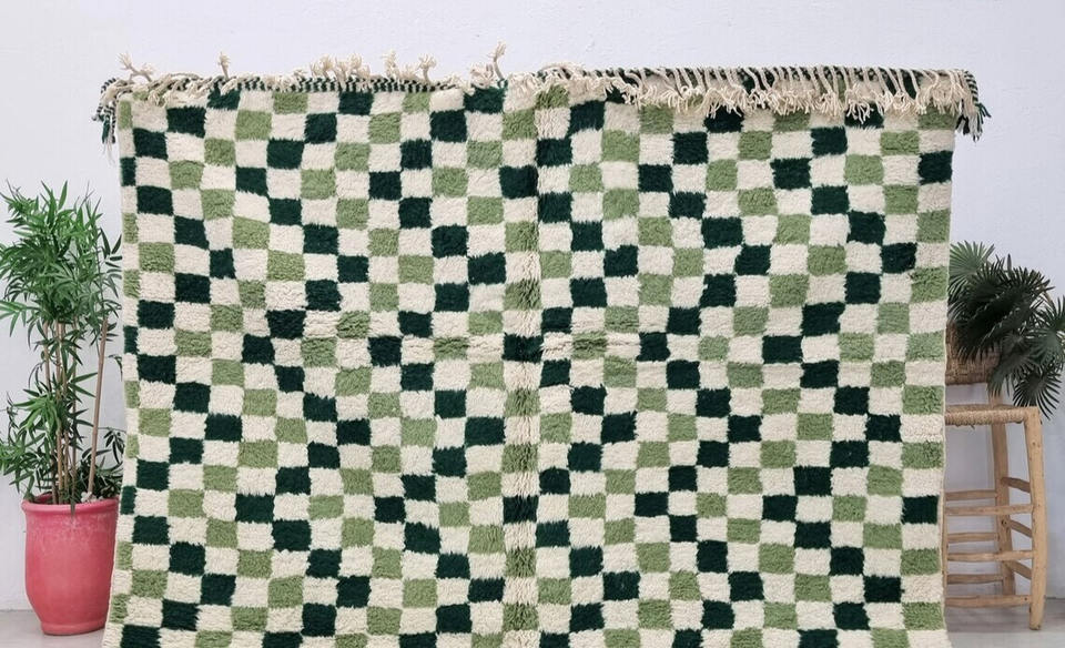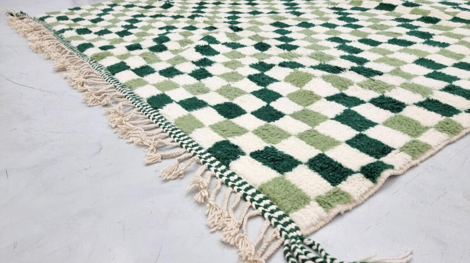 Hand Knotted 100% Wool Green Checkered Rug Handmade Moroccan Shag Rug For Home Decor Area Rug Carpet