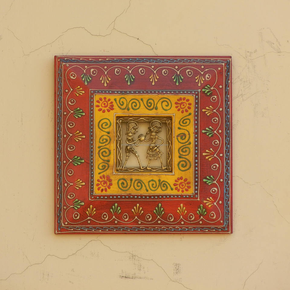 Hand Painted Bastar Art Wooden Wall Frame Diwali Wedding Birthday Anniversary Deco Style Wall Hanging with Brass Figures