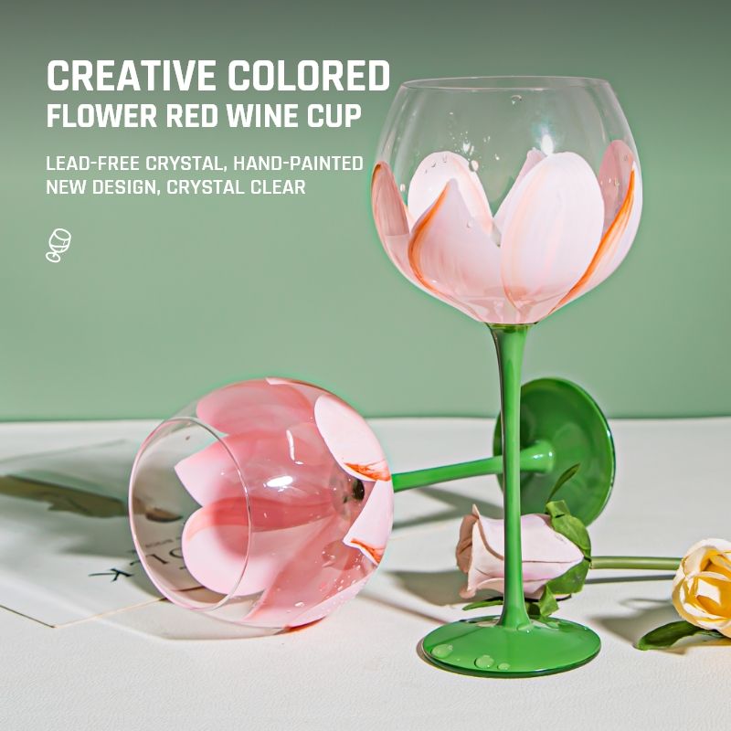 Hand-Painted Flower Pattern Red Wine Glasses Long Stem Artistic Goblets Lead-Free Crystal Colored Red Wine Glass