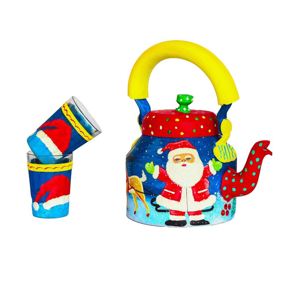 Hand Painted Santa Theme Tea Kettle Thela Set with 4 Glasses 1 Kettle & 1 Cart for Christmas Diwali Gifting Serving Use Decor