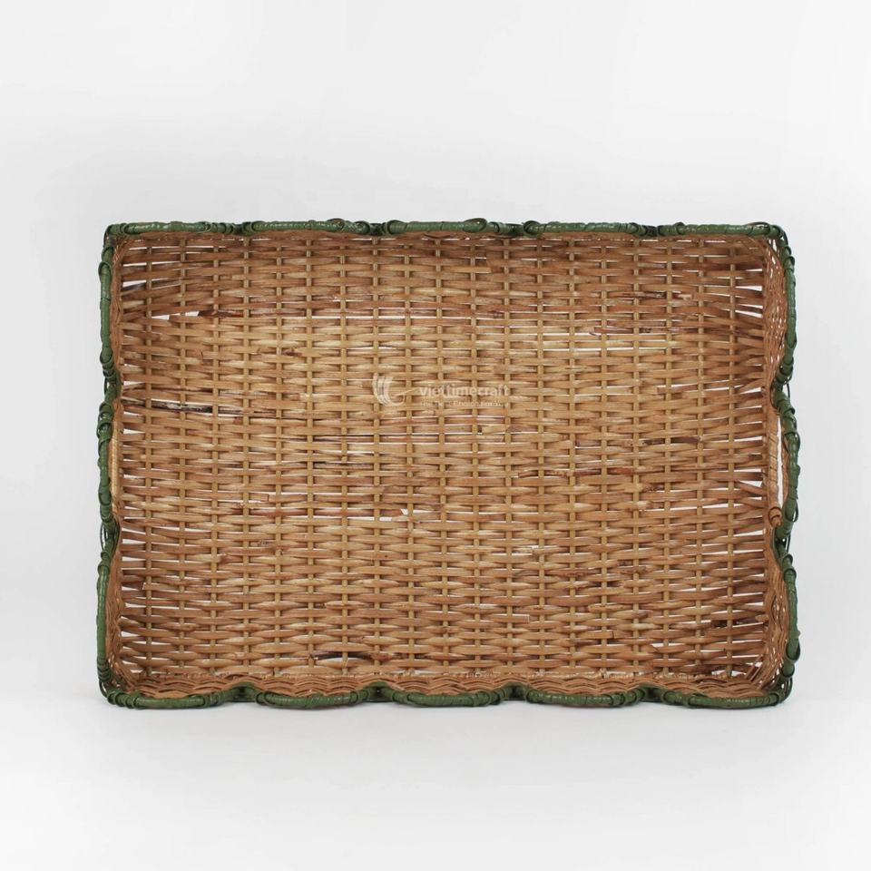 Hand Painted Scalloped Rattan Tray, Natural Scalloped Basket Tray with Green Trim Vietnam Handmade by Viettimecraft
