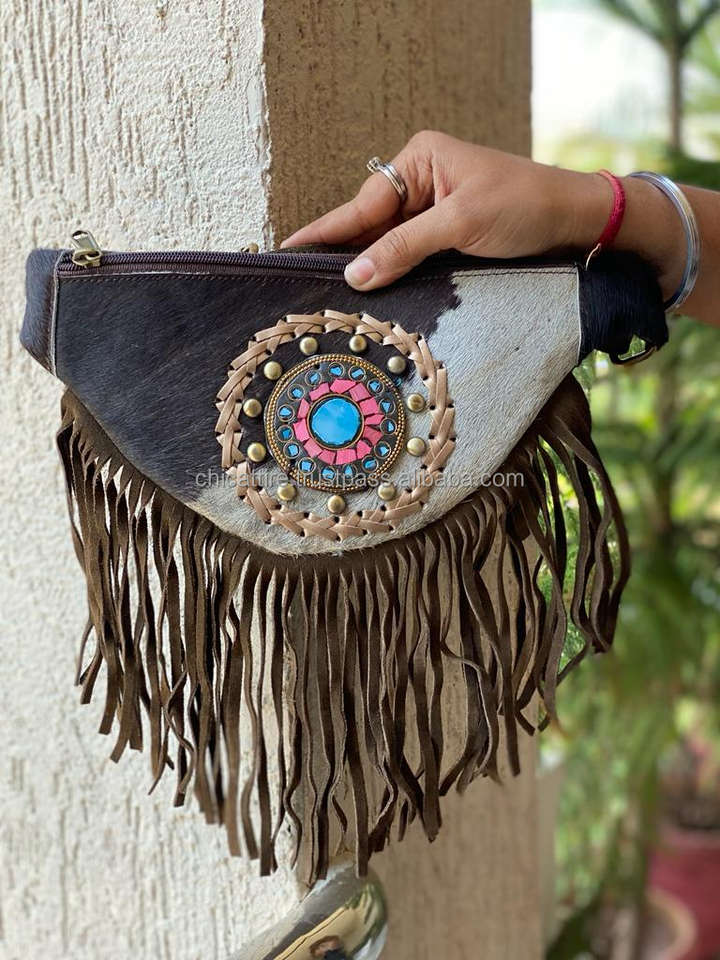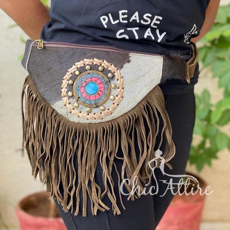 Hand Stitched Cowhide Fur Leather Hip Bag in Black Hip Pocket Belt Waist Pocket Belt Fringe Cow Hair Fringe Belts
