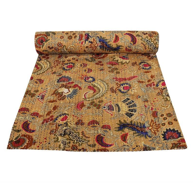 Hand Stitched Indian Cotton Kantha Quilt Floral Design Printed Kantha Throw Beautifully Crafted for Comfort and Style