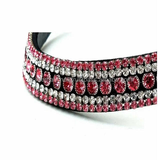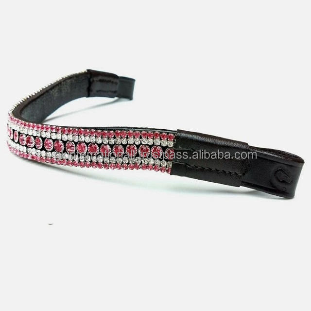 Hand Stitched Supple Leather Horse Brow Band Designed with 5 Row Top Quality Red and White Crystals Decorative Bling Brow Band