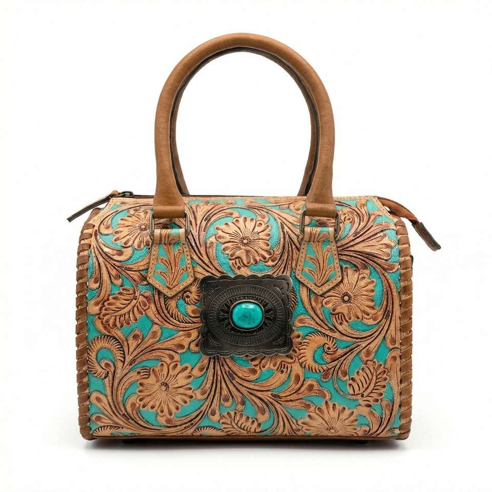 Hand Tooled 100% Genuine Leather Western Speedy Mini Duffel Bag With Turquoise Stone Studded Luxury Travel Weekend Overnight Bag