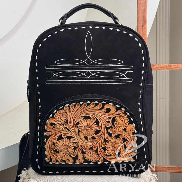Hand Tooled Black Suede Leather Boot Stitch Backpack Western Floral Concealed Carry Travel Luxury Cow Leather Laptop Backpacks