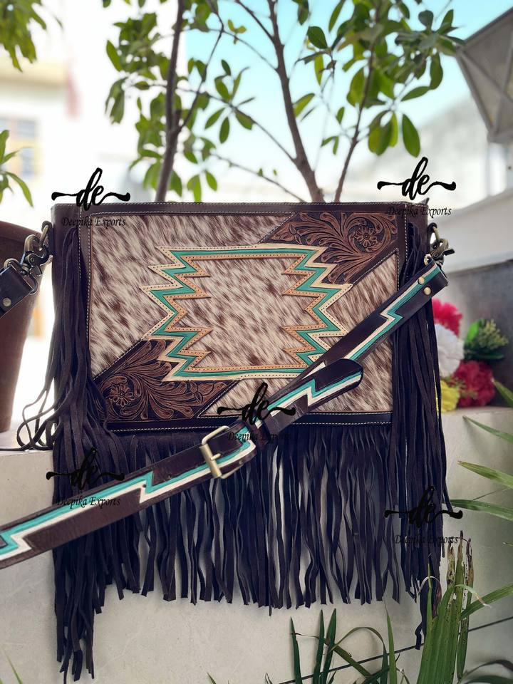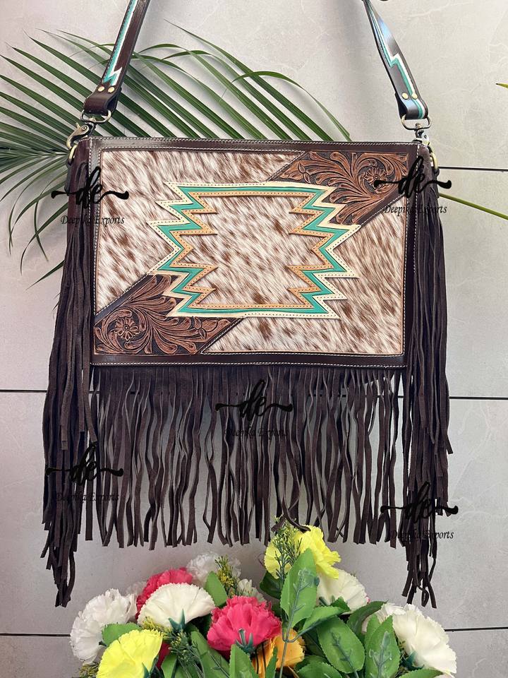 Hand Tooled Carving Leather Fringe Tote Bag Stylish Purse Cowhide Fur Leather Bags for Women's Multi Use