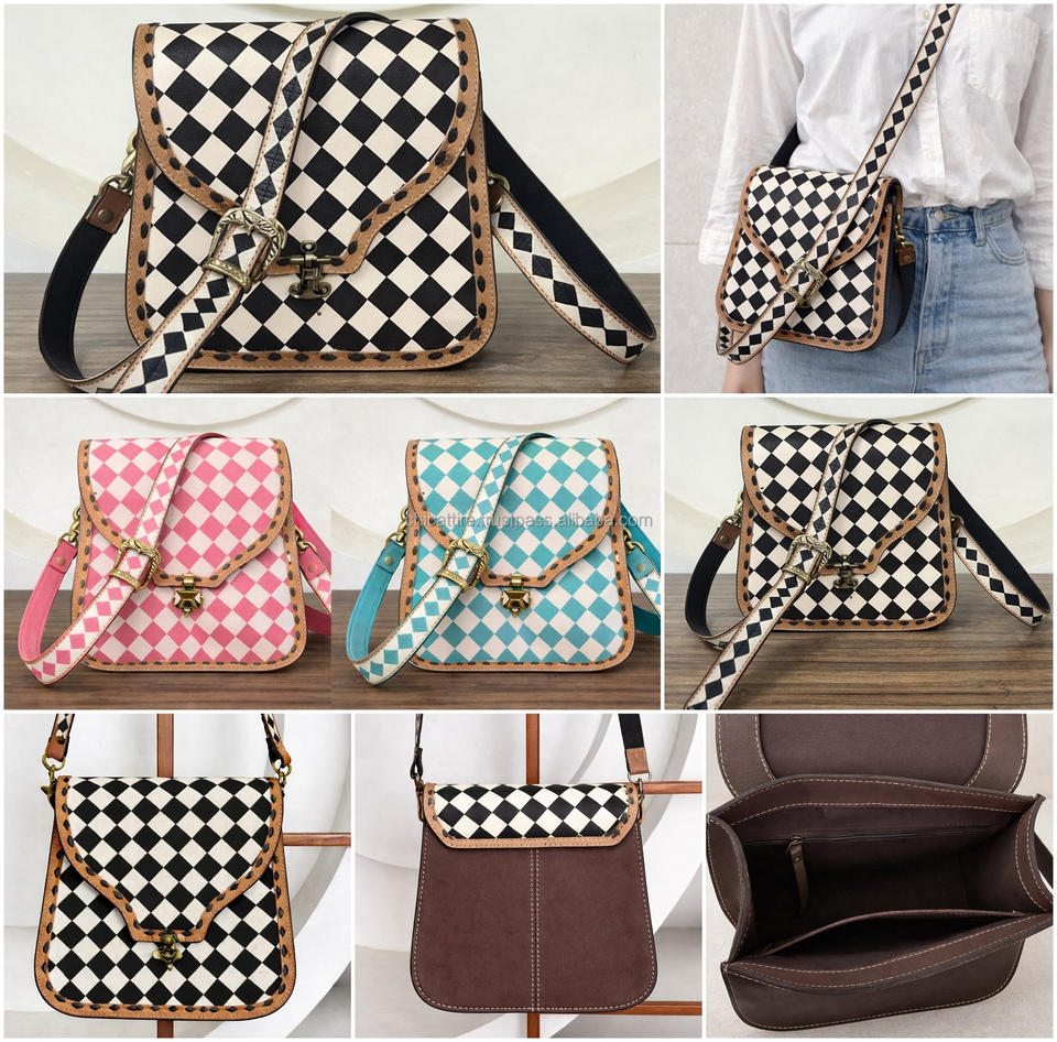 Hand Tooled Carving Leather Handbag Sling Bag Gypsy Boho New Arrival Shoulder Handmade Western Stylish Checks Design Bags