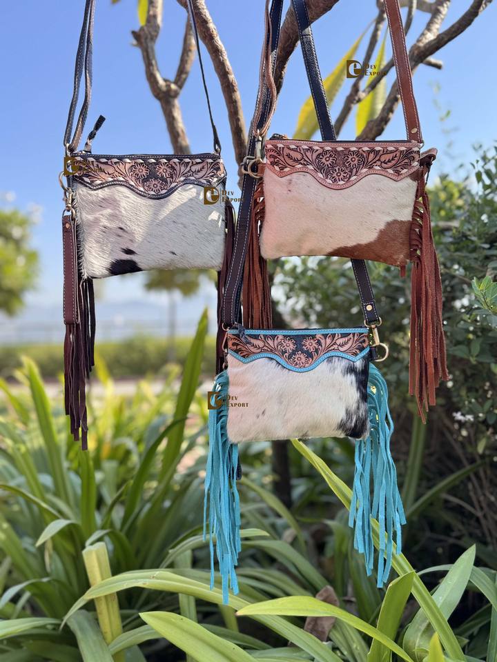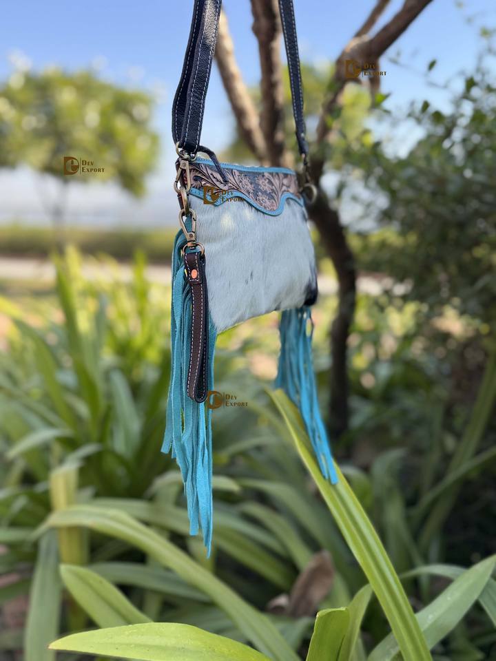 Hand Tooled Carving Leather New Arrival Fringe Handbag Stylish Purse Cowhide Fur Leather Turquoise Colour Bags Women's Multi Use