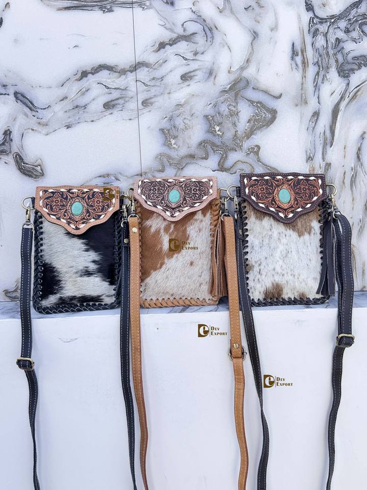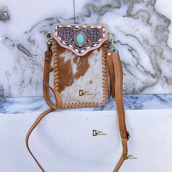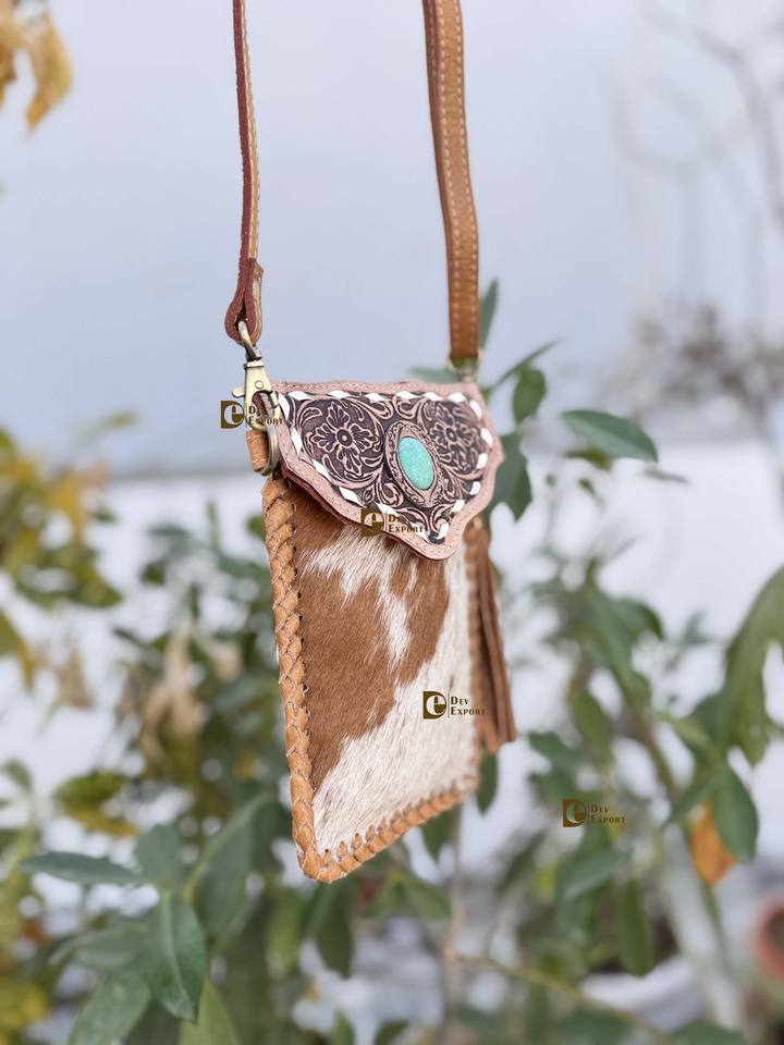 Hand Tooled Carving Turquoise Stone Sling Leather Bag Small Size Phone Purse Hair On Hide Fur Leather Handbag Wristlet Pouch