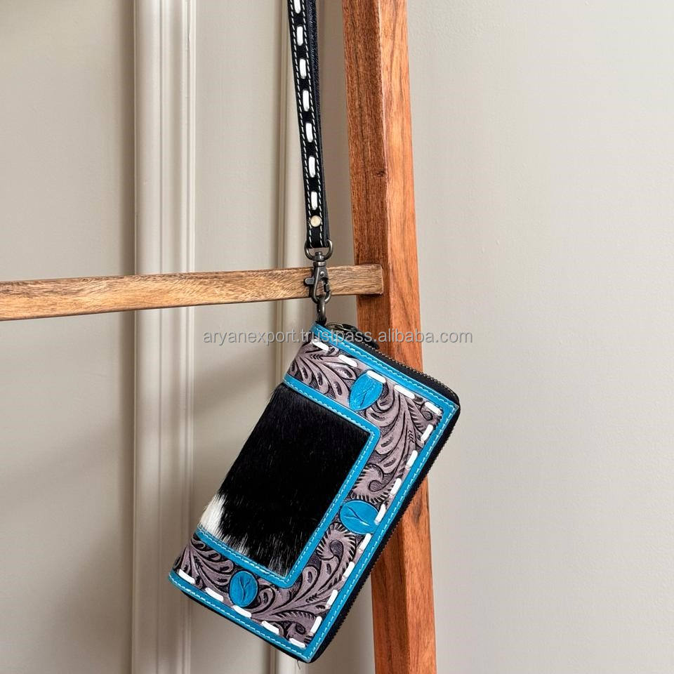 Hand Tooled Carving Wallet Clutch Phone Case Stylish Cowhide Fur Leather Hot Sale Wallet Multi Uses Western Leather Wallets
