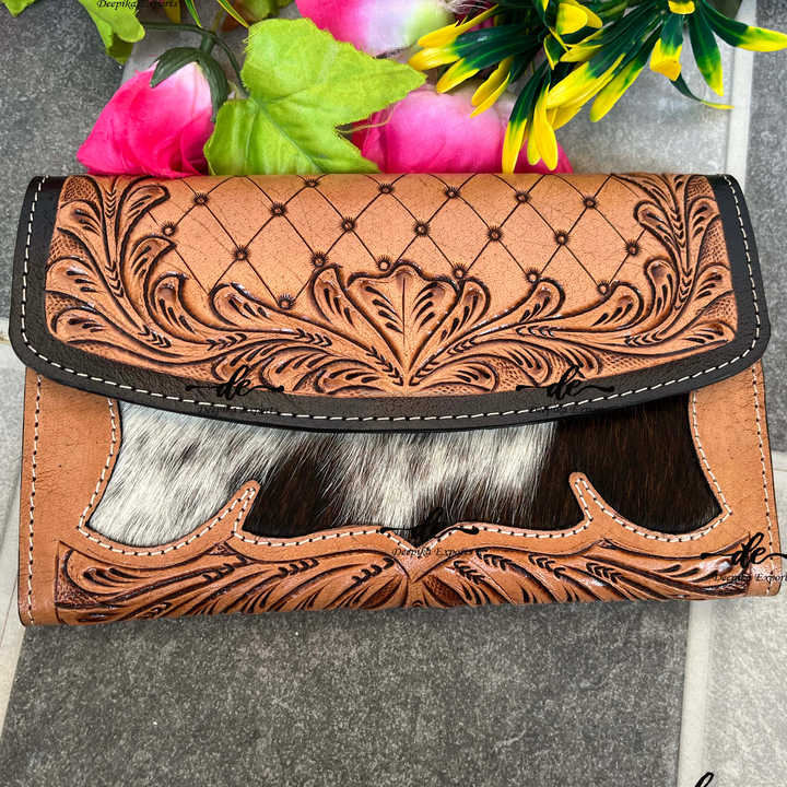 Hand Tooled Carving Wallet Clutch Phone Case Stylish Genuine Leather Cowhide Fur Wallet Multi Uses Western Leather Wallets