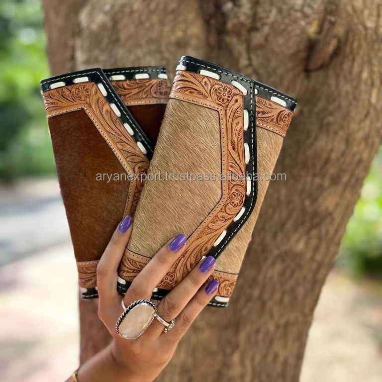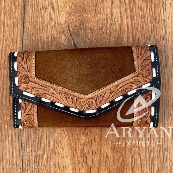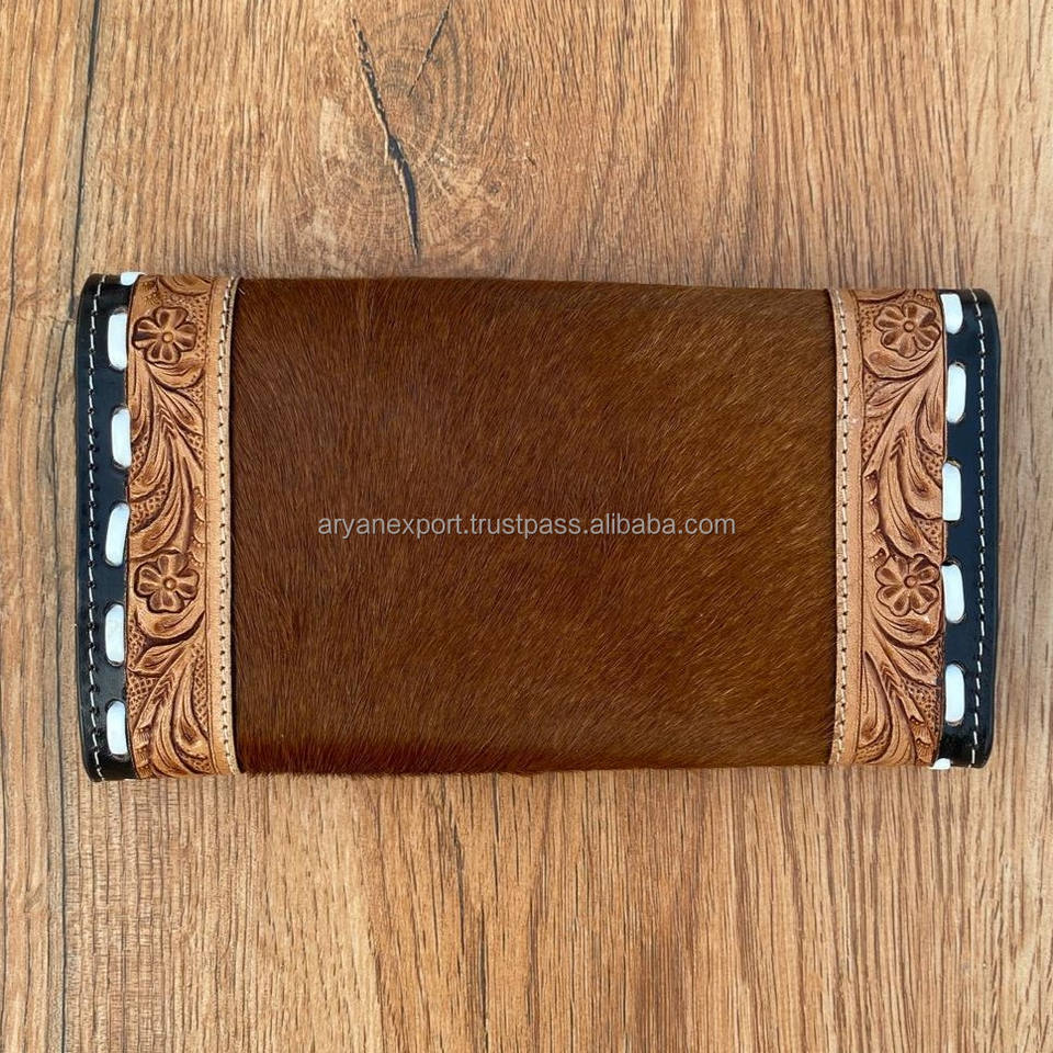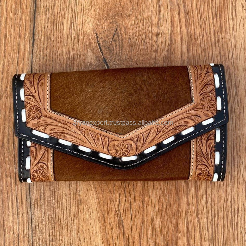 New Design Clutch for Women's Hand Tooled Carving Wallet Clutch Western Stylish Hot Sale Cowhide Fur Wallet Multi Uses