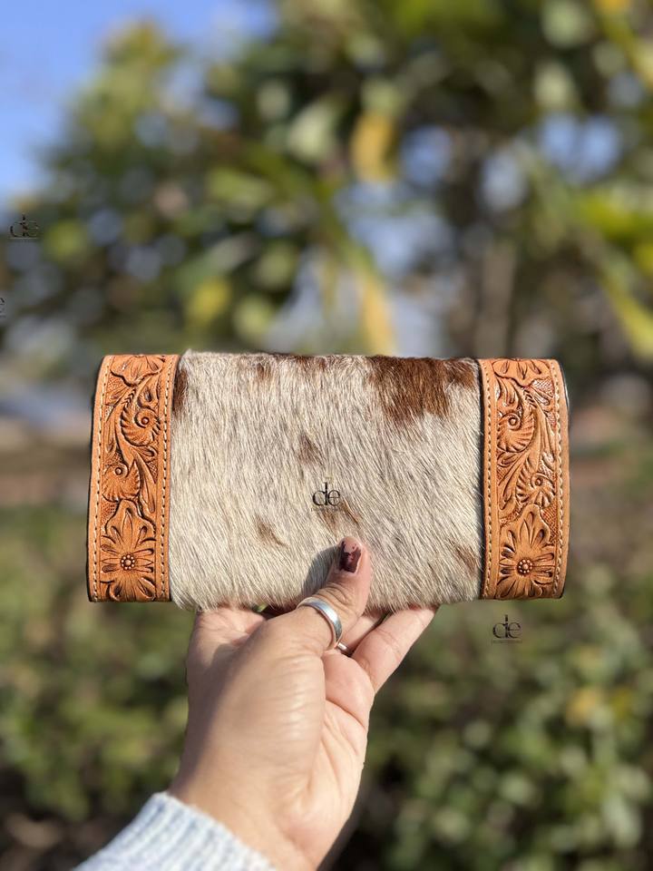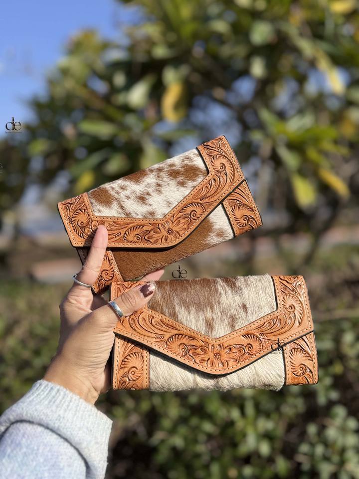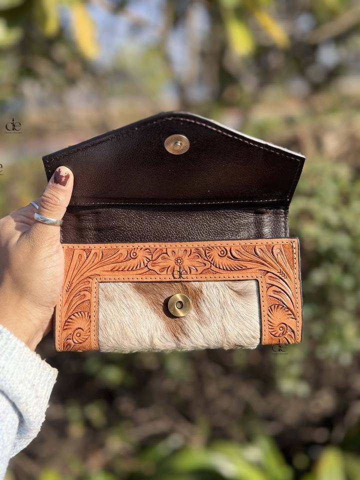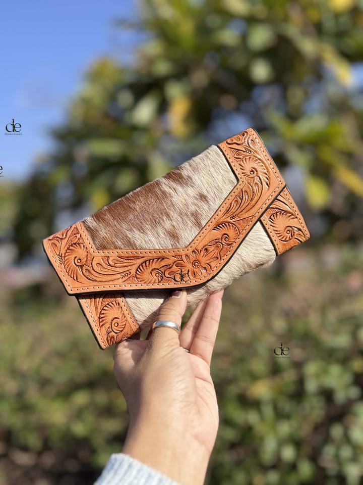 Hand Tooled Carving Wallet Clutch Stylish Cowhide Fur Leather Wallet Multi Uses Western Leather Clutches for Women's Uses