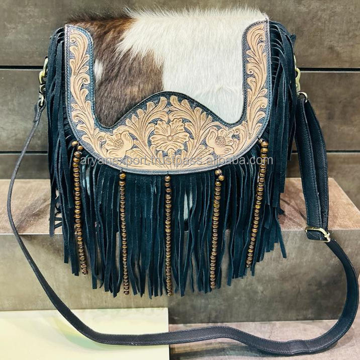 Hand Tooled Cowhide Fur Leather Beads Fringe Handbag Stylish Women Colorful Tooling Leather Sling Bag Ideal Size Cross Body Bag