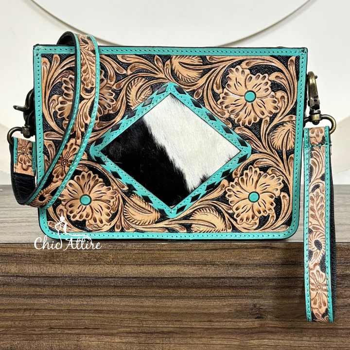 Hand Tooled Checkered Leather Sling Bag With Wristlet