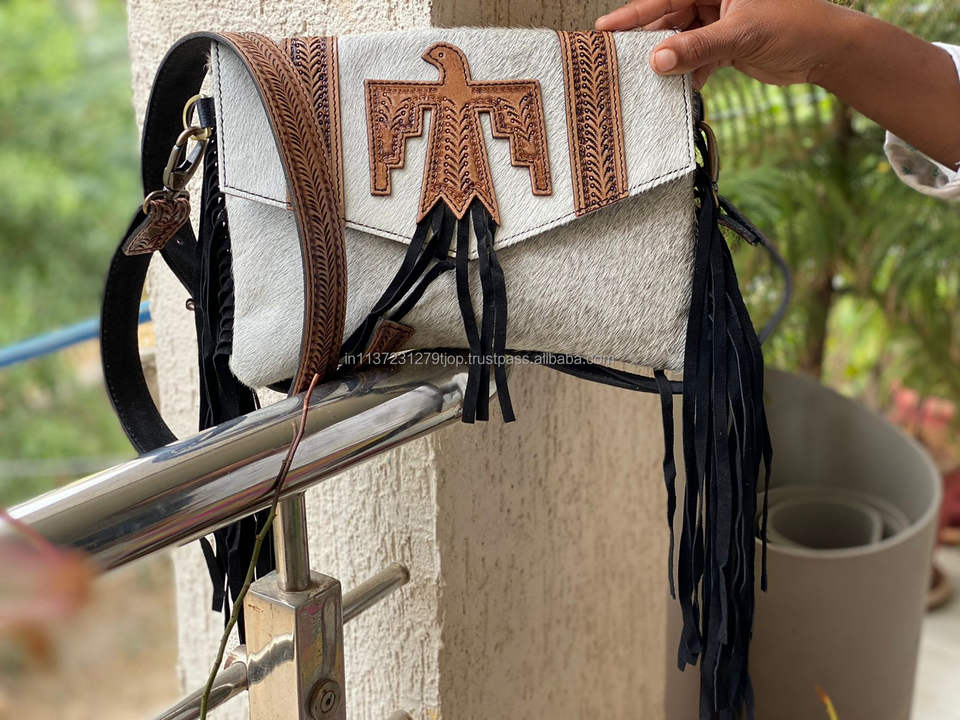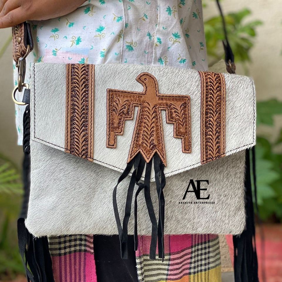 Hand Tooled Hair on Hide Fur Leather Fringe Handbag Stylish Women Carved Tooling Leather Shoulder Bag Big Size Crossbody Bags