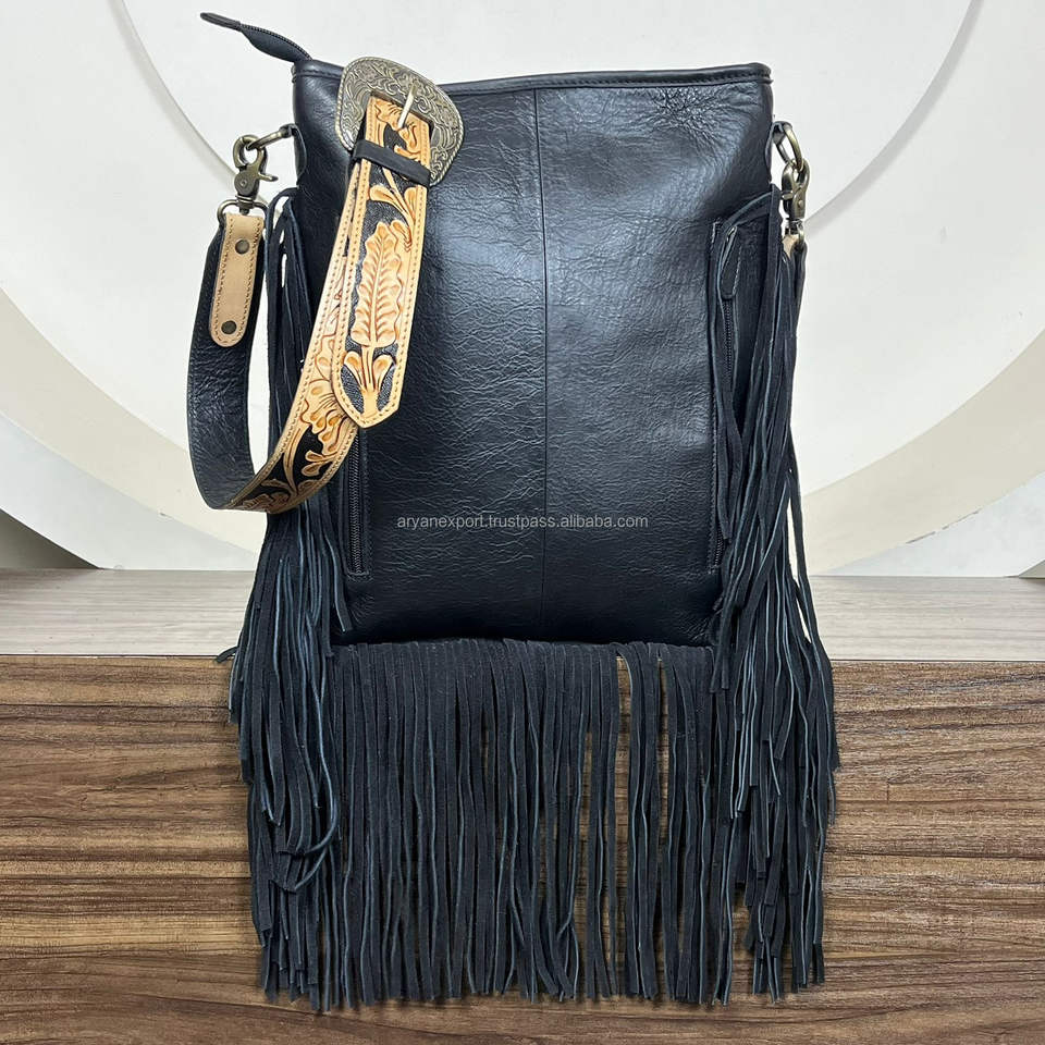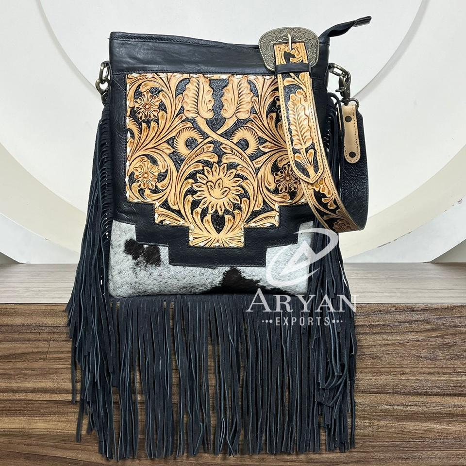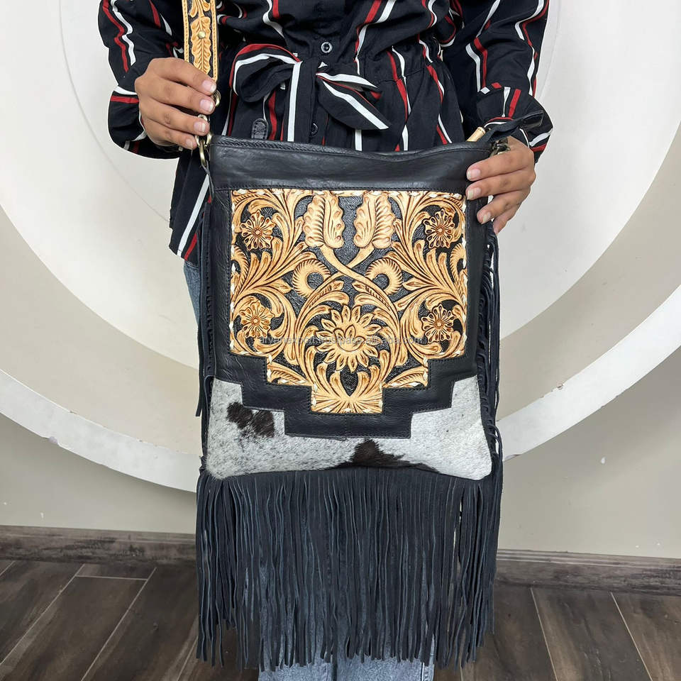 Hand Tooled Cowhide Fringe Crossbody Bag