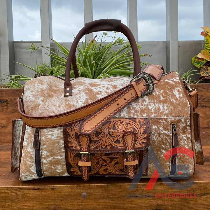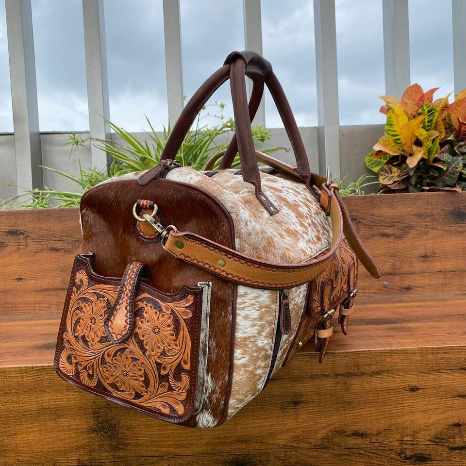 Hand Tooled & Hair on Cowhide Leather Large Duffel Bag Genuine Leather Overnight Luggage Bag Travel Weekender Bags for Unisex