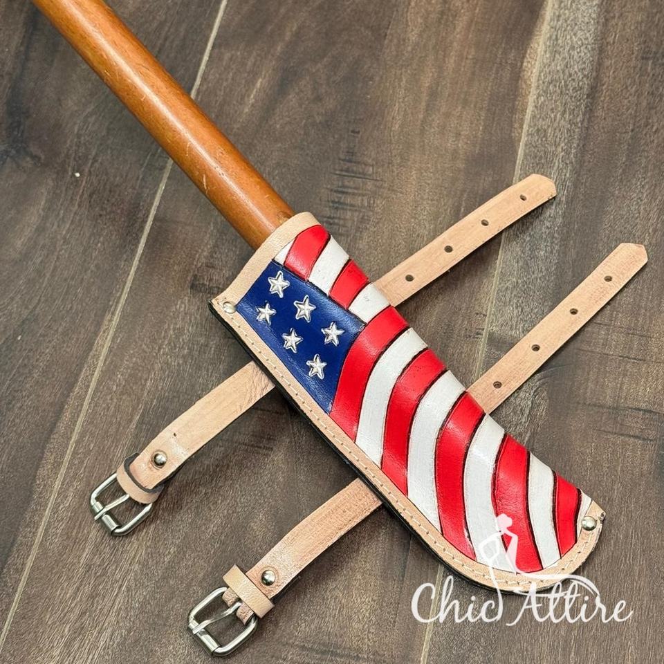 Hand Tooled Leather American Flag Tooling Holder Patriotic Pole Holster with Buckle Straps Durable Custom Design USA Flag Mount