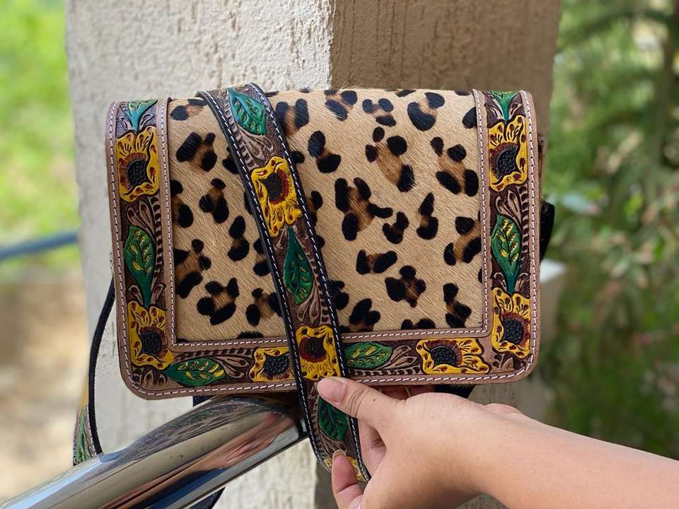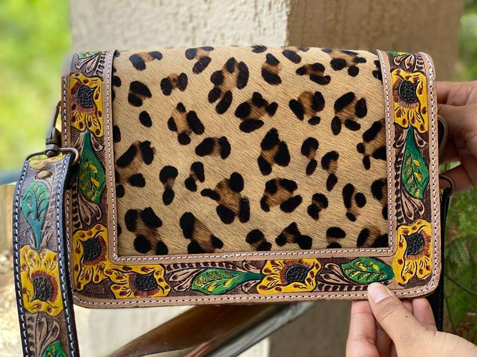 Hand Tooled Leather Bag Handbag Sling Bag Tooled Leopard Fur Leather Purse Women Leather Bags