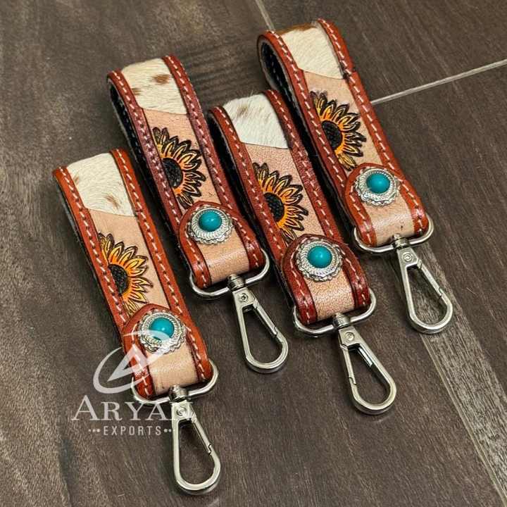 Hand Tooled Leather Carabiner Keychain with Cowhide Sunflower Design & Turquoise Stone Genuine Leather Key Strap Small Keychains