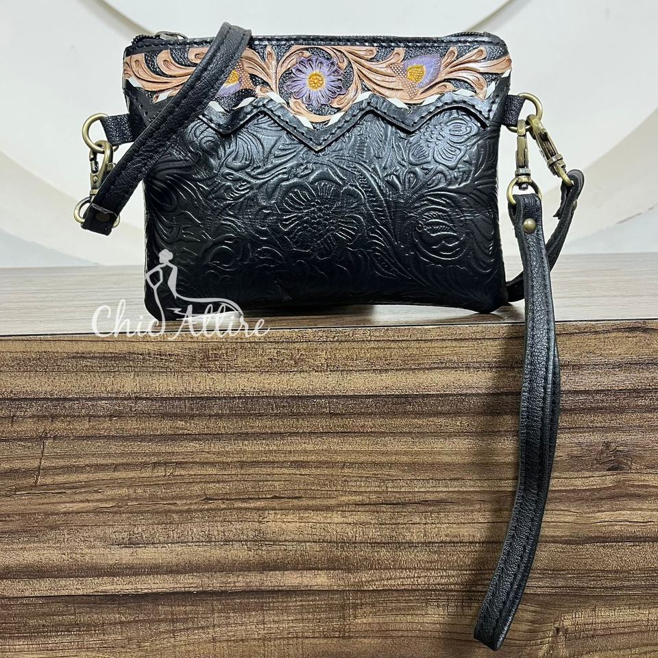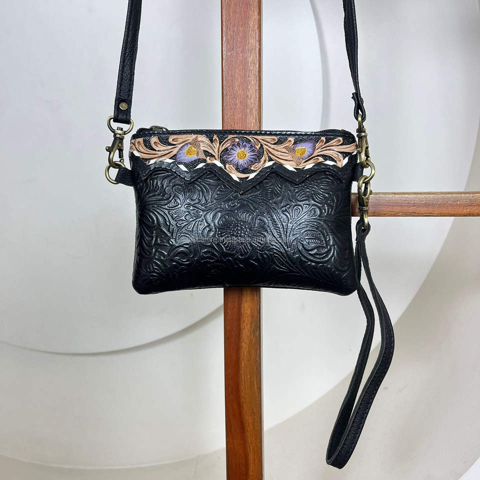 Hand Tooled Leather Crossbody Mini Bag for Women Embossed Unique Floral Design Shoulder Wristlet Purse Western Small Handbags