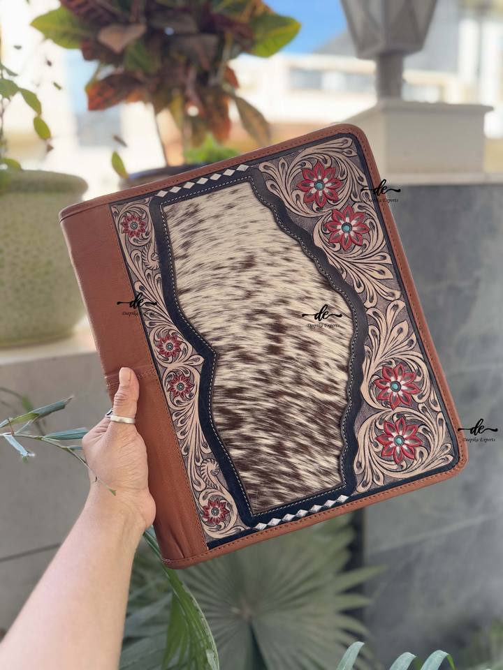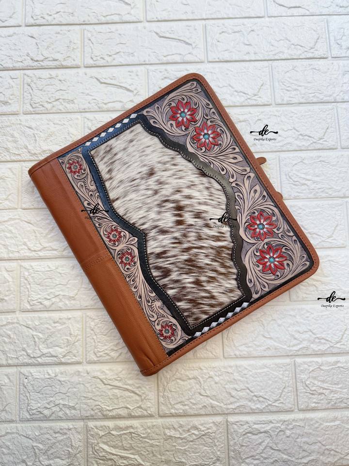 Hand Tooled Leather Zipper Lock Business Portfolio Binder Manufacture Cowhide Multi-function Document Folder With Card Holder