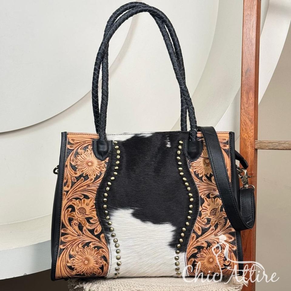 Product name:Hand Tooled Cowhide Leather Crossbody Tote Bag