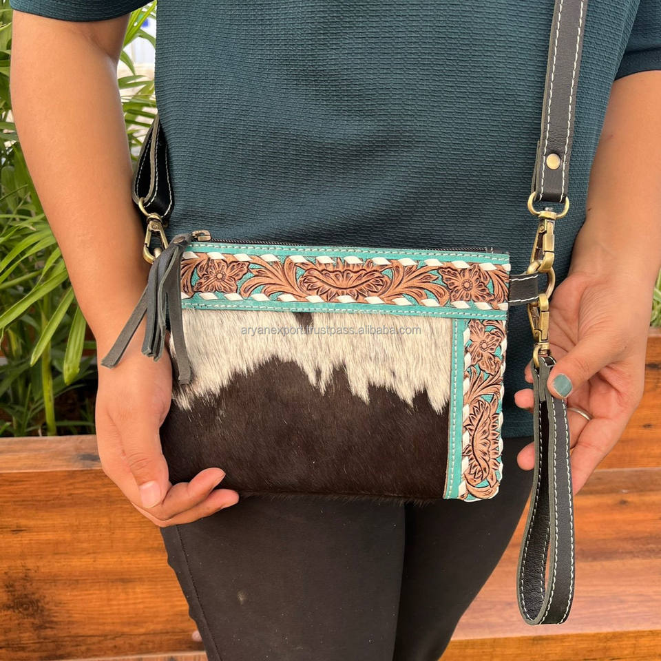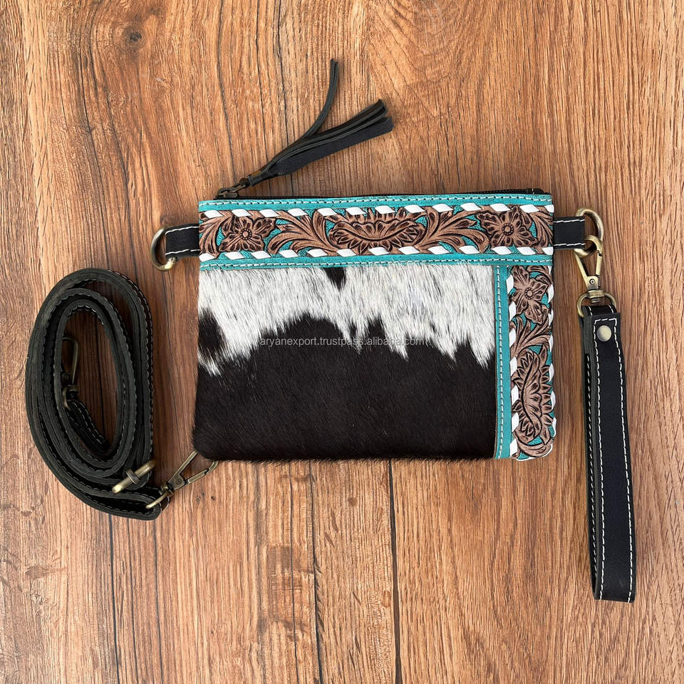 Hand Tooled Leather Small Tassel Crossbody Women's Bag Western Hair on Genuine Leather Wristlet Purse Turquoise Cowhide Handbags