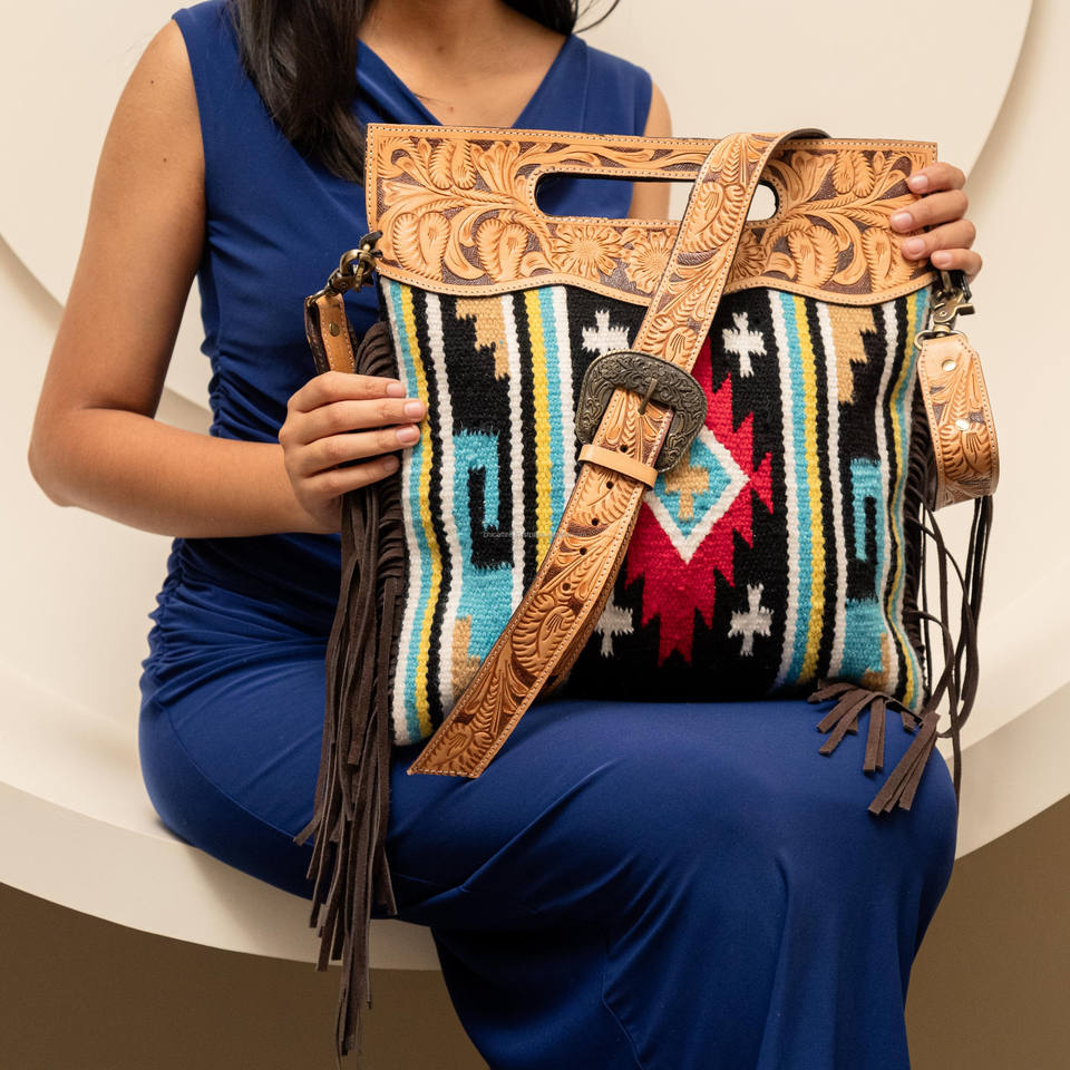 Hand Tooled Leather Southwestern Saddle Blanket Top Handle Handbag for Women's High Quality Genuine Leather Fringe Shoulder Bags