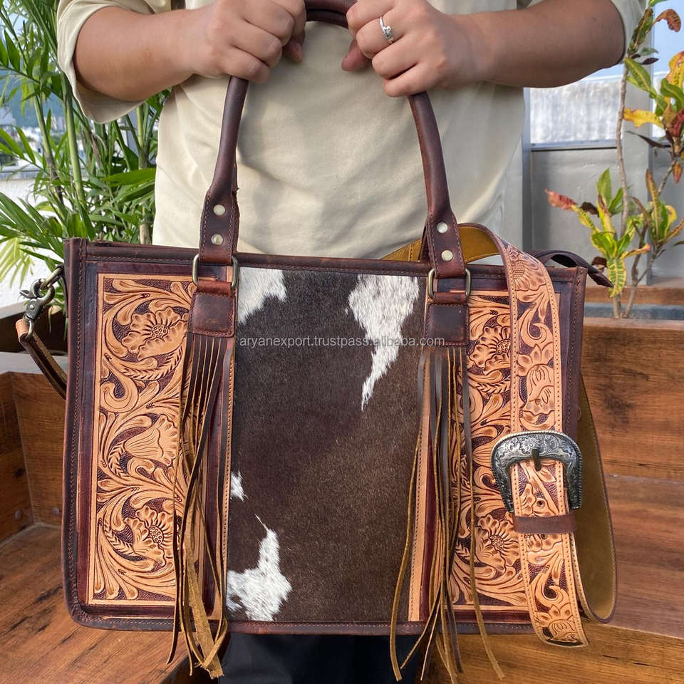 Hand Tooled Leather Tote Bags Western Hair on Cowhide Shoulder Crossbody Handbag for Women's Genuine Leather Custom Floral Purse