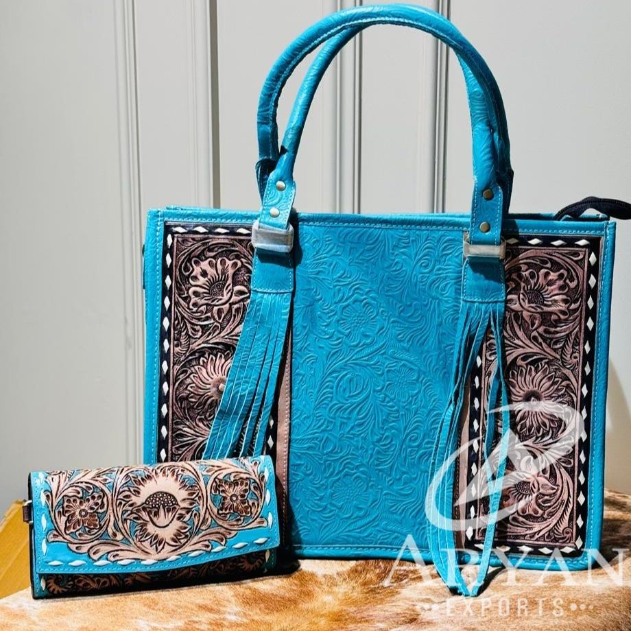 Hand Tooled Leather Turquoise Floral Large Tote Bag & Western Fashion Hand-Tooled Turquoise Wristlet Wallet Combo Sets for Women
