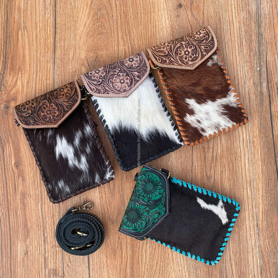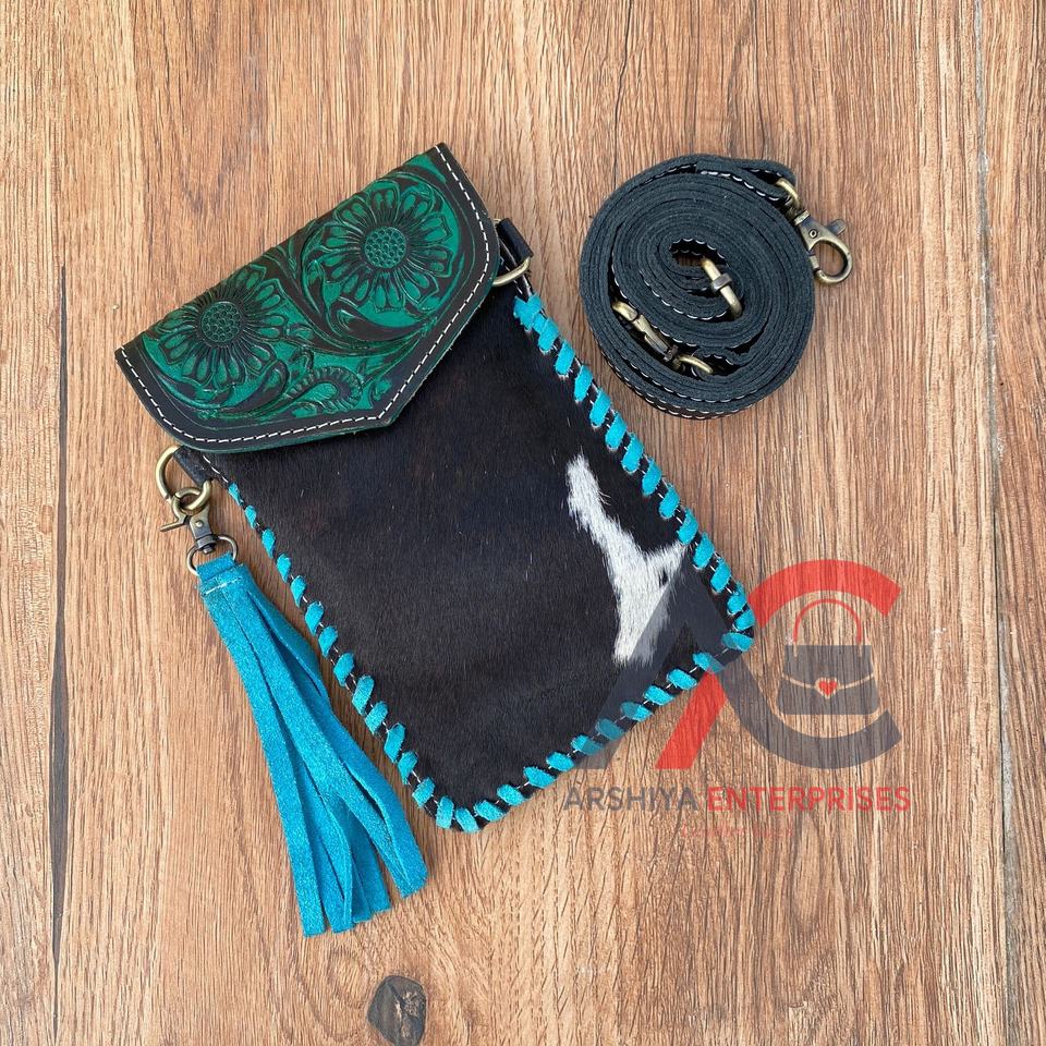 Hand Tooled Leather Turquoise Tassel Crossbody Phone Holder Hair on Cowhide Floral Cell Phone Smart Phone Mobile Bag for Women's