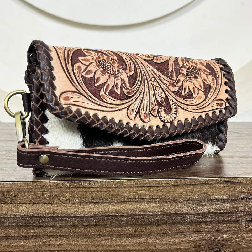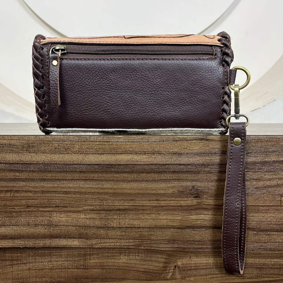 Hand Tooled Leather and Cowhide Wallet With Wristlet Strap Elegant Large Capacity Purse For Women 's Perfect For Western Fashion