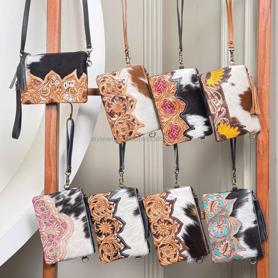 Hand Tooled Mini Handbag Fashion New Arrival Genuine Cowhide Leather Crossbody Clutch Bags Purse with Tassel Zipper for Women's
