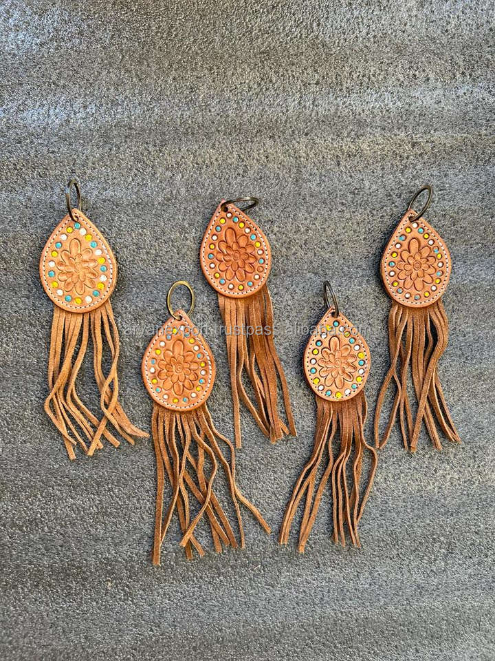 2025 Custom Tooled Cowhide Leather Turquoise Tassel Keyrings Personalized Hand Painted Soft Genuine Leather Keyfob for Multi Use