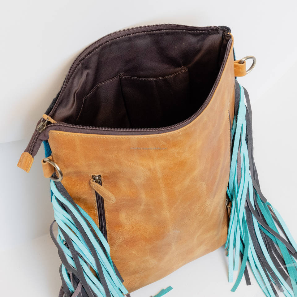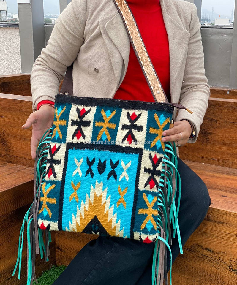 Hand Tooled & Saddle Blanket Crossbody Bag Hot Sale Genuine Leather and Turquoise Wool Fringe Concealed Carry Purse for Women's