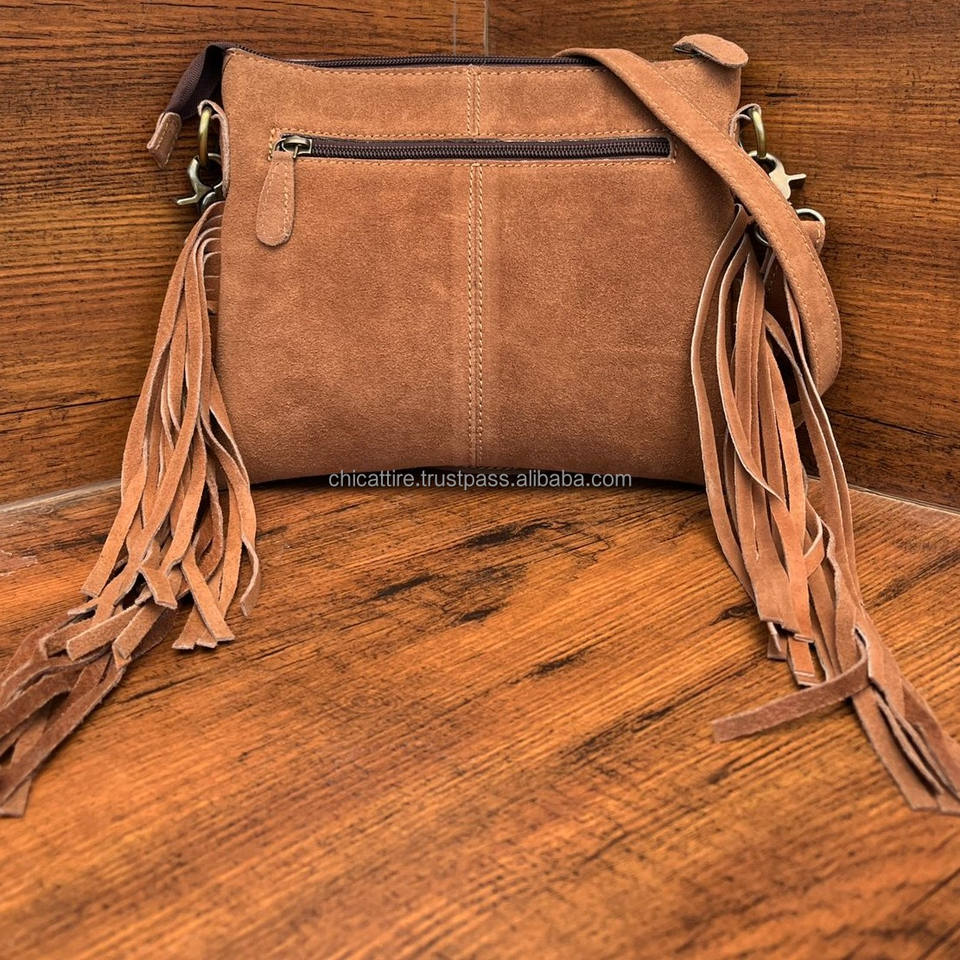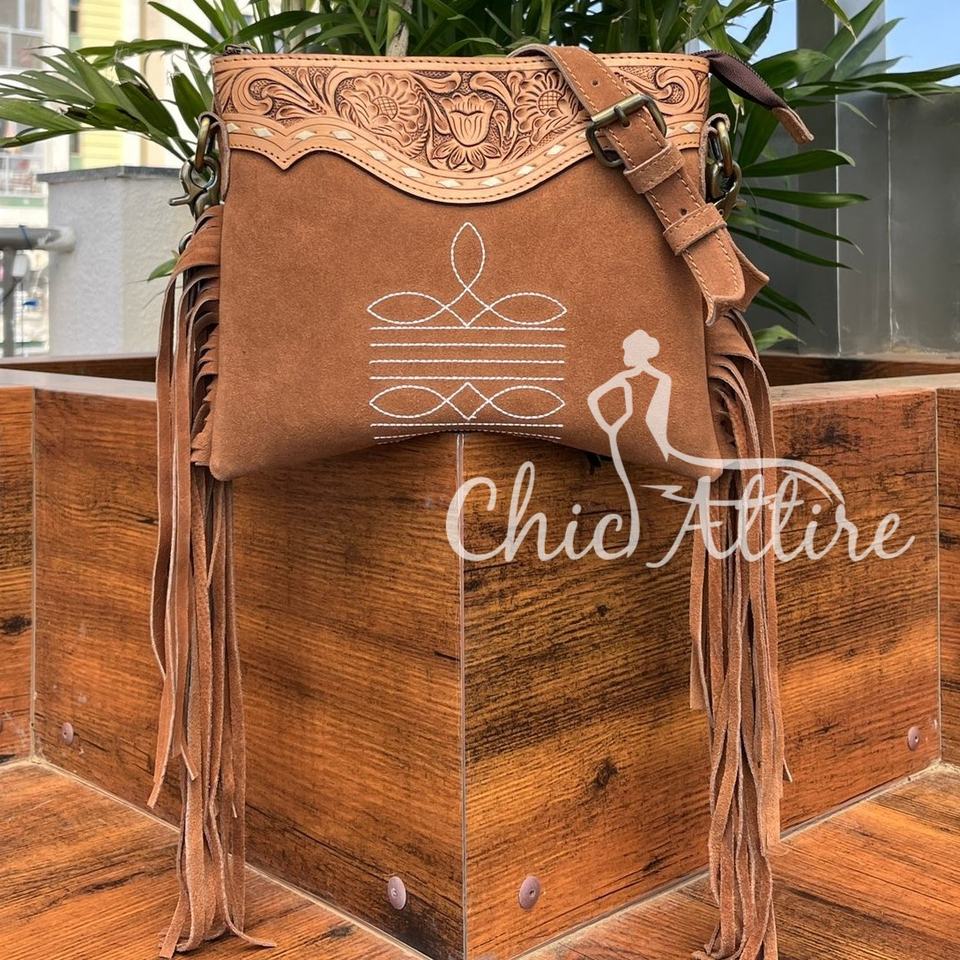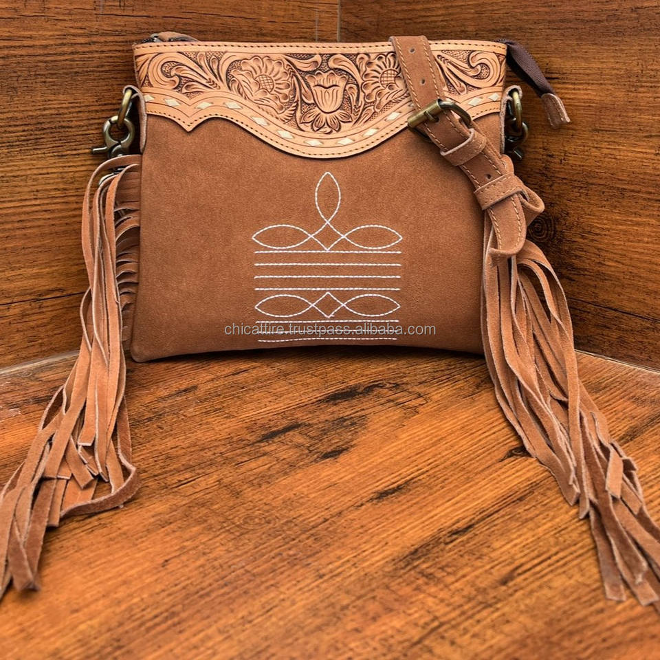 Hand Tooled Suede Leather Boot Stitch Fringe Crossbody Bag for Women's Western Genuine Leather Handbag Bohemian Cowhide Purse