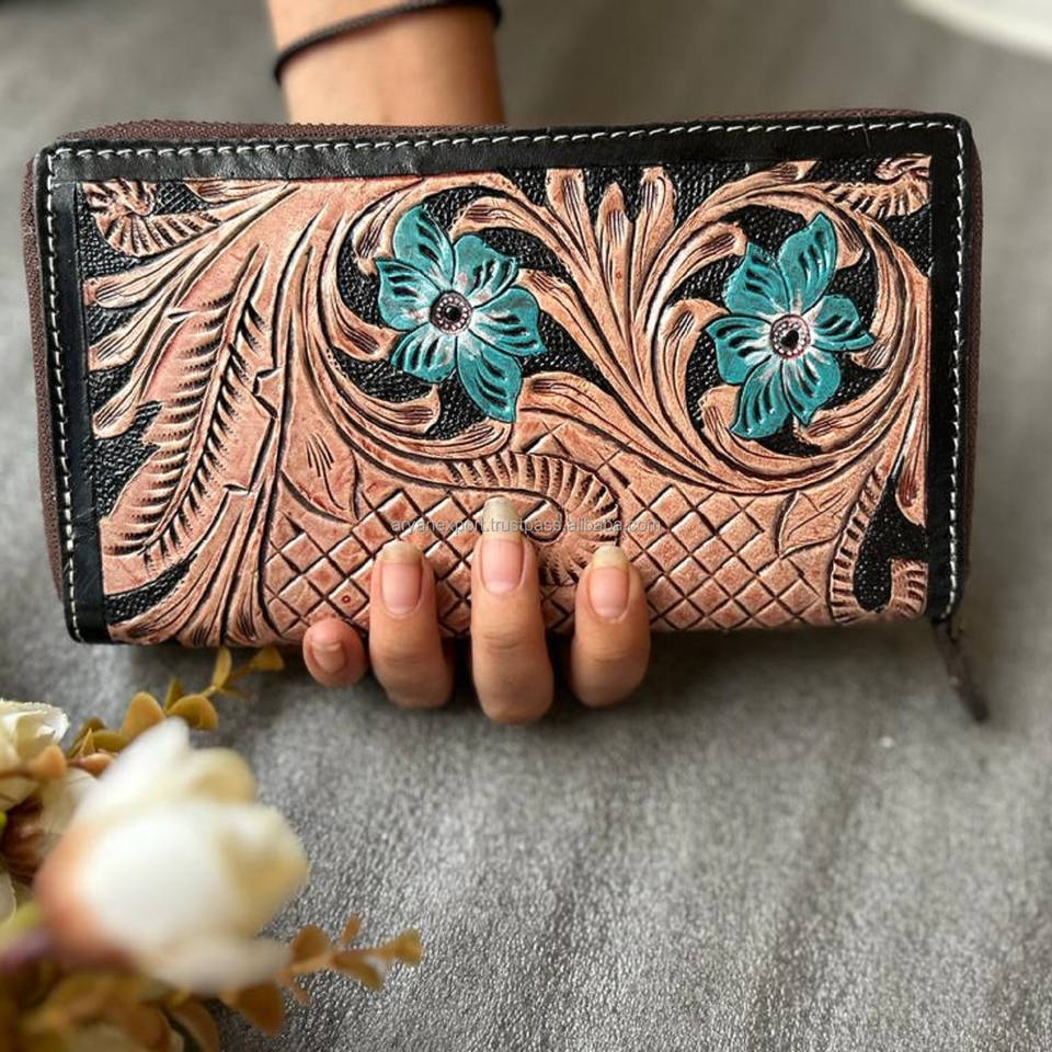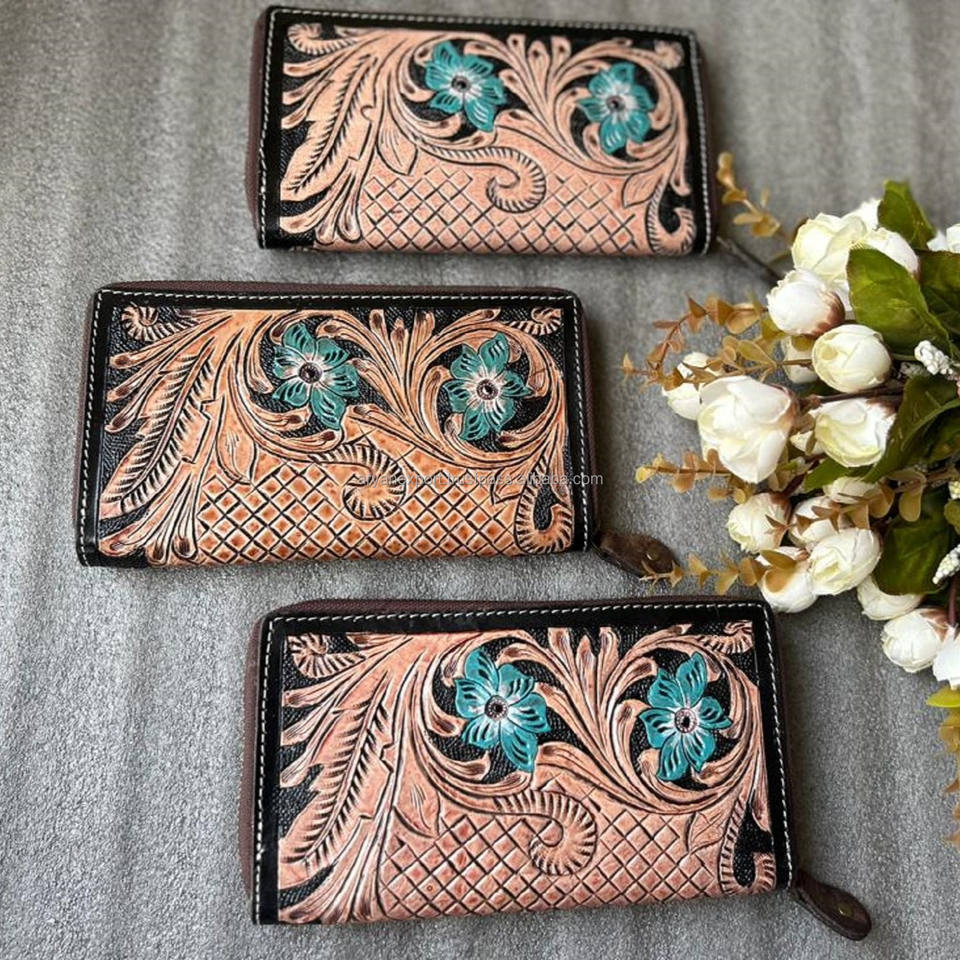 Hand Tooled Turquoise Flower Leather Wallet Stylish Genuine Leather Zip Continental Purse Western Clutch Card Case Gifts for Her